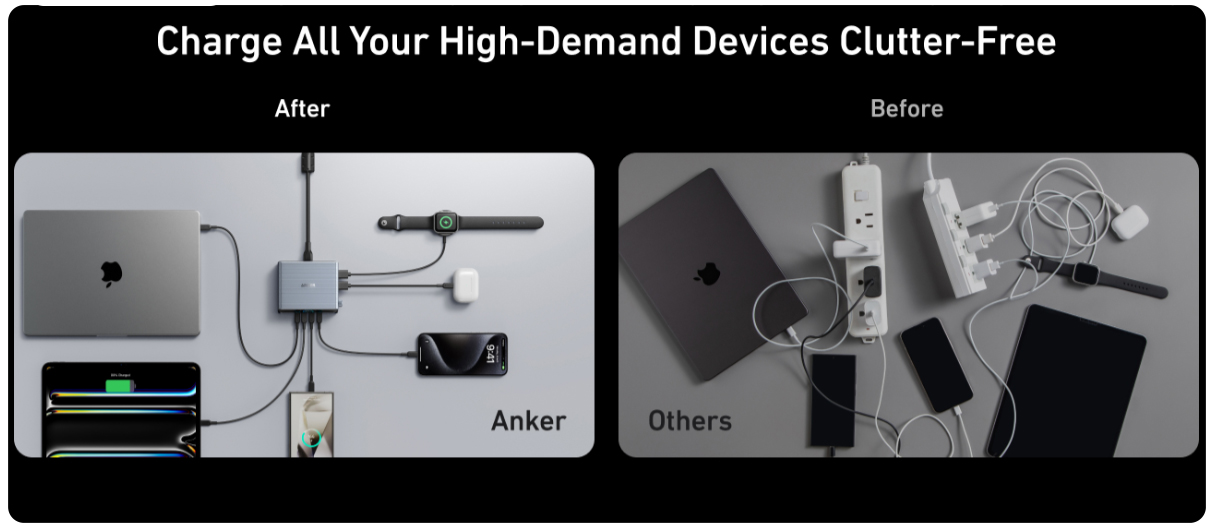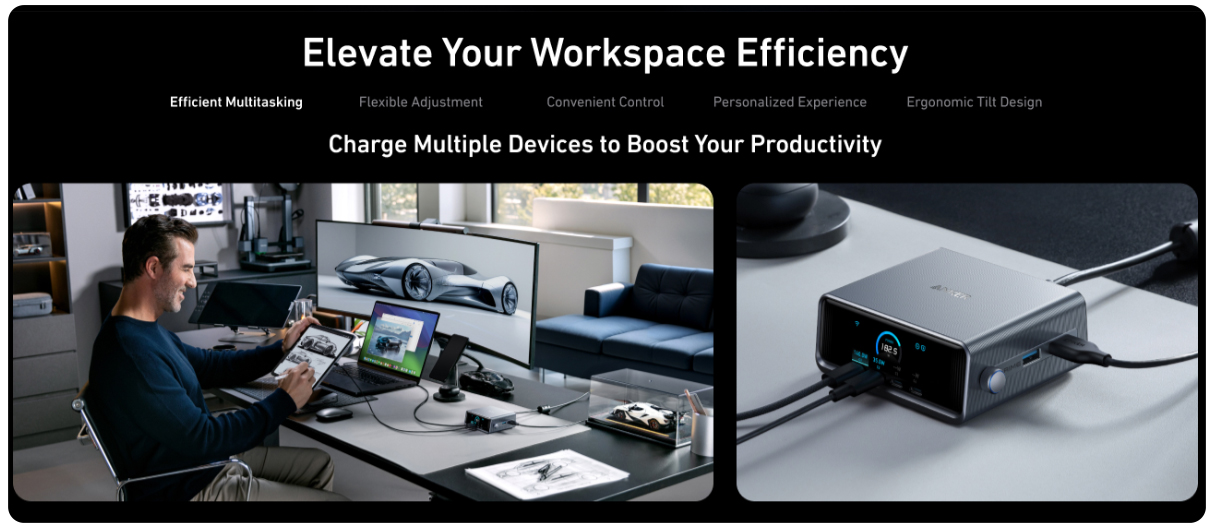 اگر به دنبال شارژر رومیزی قدرتمند و حرفهای برای شارژ همزمان چند دستگاه هستید، شارژر ۶ پورت انکر ۲۵۰ وات مدل A2345 بهترین انتخاب شماست. این شارژر با توان فوقالعادهی ۲۵۰ وات، امکان شارژ لپتاپ، موبایل، تبلت و سایر گجتها را با بالاترین سرعت ممکن فراهم میکند.