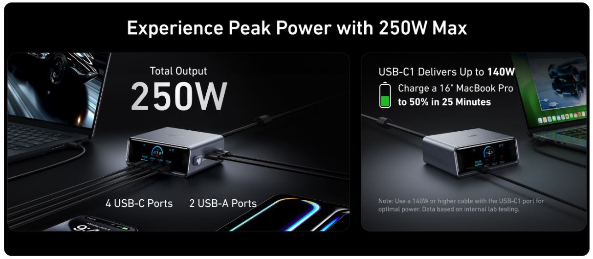 - توان خروجی 250 وات، این شارژر قادر است به سرعت و به طور همزمان چندین دستگاه را شارژ کند