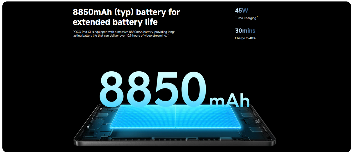 یکی از نقاط قوت جدی Poco Pad X1، باتری با ظرفیت بالا 8850 میلیآمپر ساعتی این تبلت است.