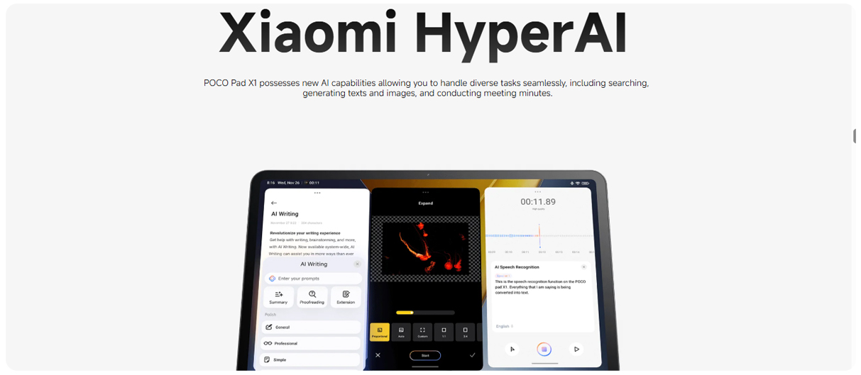 Poco Pad X1 با رابط کاربری بهینهشده هایپر او اس (بر پایه اندروید) عرضه میشود که برای نمایشگر بزرگ بهینه شده است. پشتیبانی از حالت Split Screen و Multi-Window باعث میشود همزمان چند برنامه را اجرا کنید؛ ویژگی مهم برای فروشندههای آنلاین و دانشجویان.