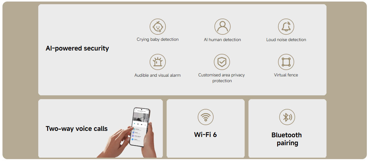 - تشخیص هوشمند انسان، تشخیص صدای گریهی کودک، تشخیص صدای بلند و امکان تعریف «حریم مجازی» (virtual fence) برای وارد/خارج شدن منطقه خاص